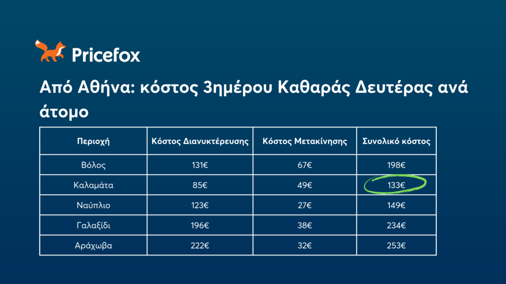 Πιο συγκεκριμένα, το Γαλαξίδι αναδεικνύεται η οικονομικότερη επιλογή με €121/ άτομο, ενώ η Καλαμάτα ακολουθεί με €134/ άτομο.