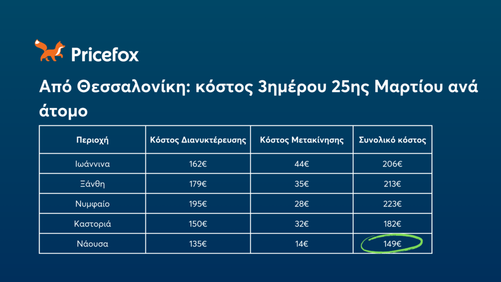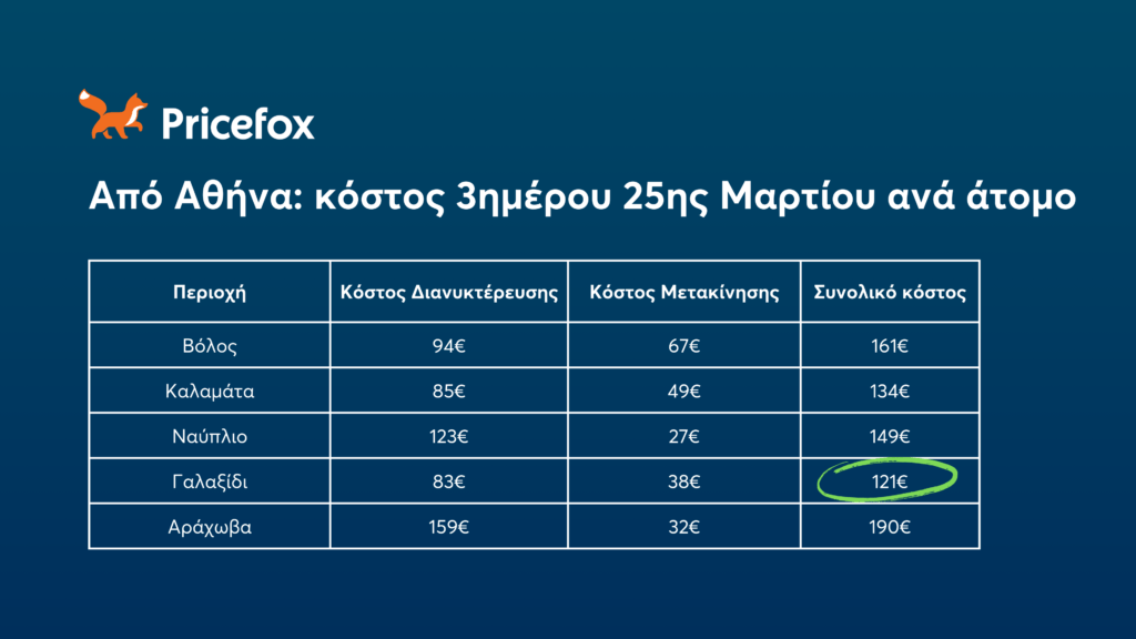 Βλέπουμε, λοιπόν, ότι για τα δύο τριήμερα ο οικονομικότερος προορισμός από Αθήνα αναδεικνύεται το Γαλαξίδι για εκδρομή το τριήμερο της 25ης Μαρτίου με €121/ άτομο και από Θεσσαλονίκη η Νάουσα για το τριήμερο της 25ης Μαρτίου, επίσης, με €149/ άτομο.