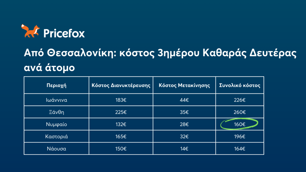 Οικονομικότερη επιλογή είναι η Νάουσα με €149/ άτομο και ακολουθεί η Καστοριά με €182.