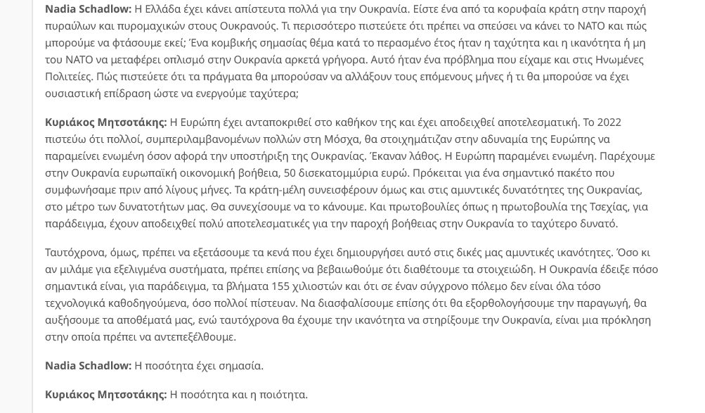 Η Ελλάδα έκρινε ότι οφείλει να βρίσκεται στη «σωστή πλευρά της Ιστορίας» και στη βάση αυτής της απόφασης ενισχύει την Ουκρανία. Μία ανεξάρτητη και κυρίαρχη χώρα, η οποία το 2022 δέχθηκε την εισβολή της Ρωσίας, που ακόμη διεξάγει πόλεμο εναντίον της με στόχο την κατάληψη και προσάρτηση εδαφών.