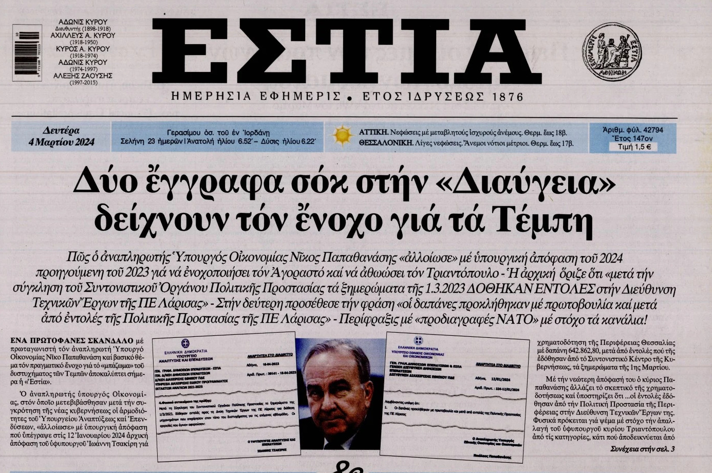 Δείτε το πρωτοσέλιδο της εφημερίδας ΕΣΤΙΑ.